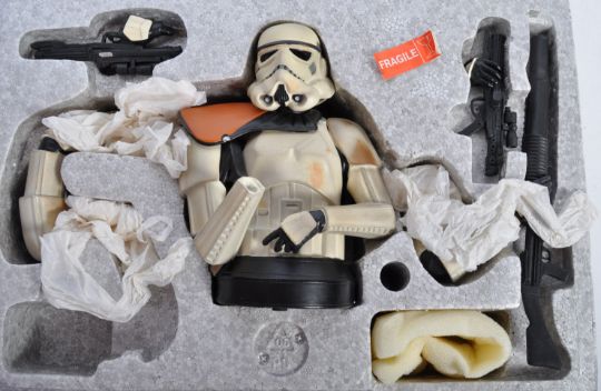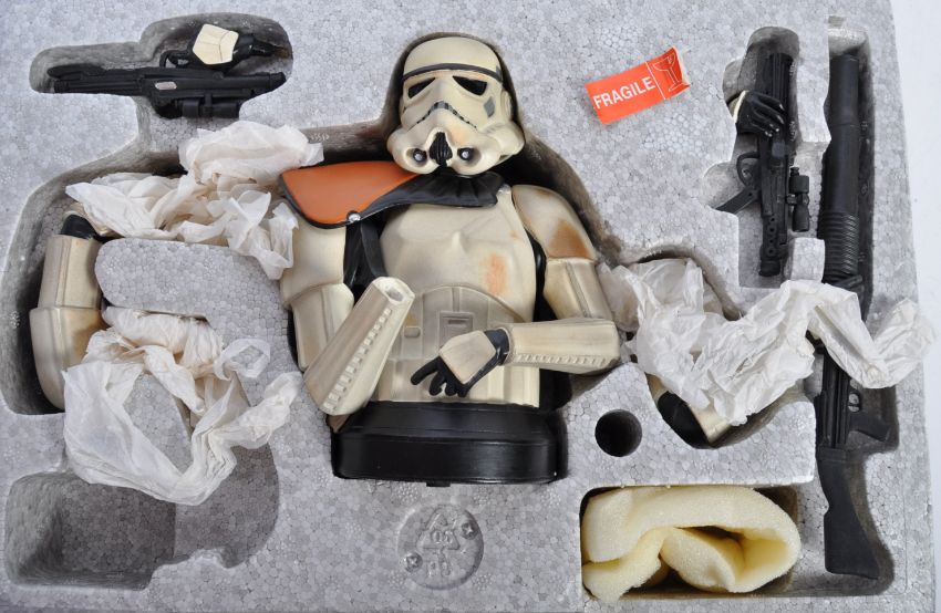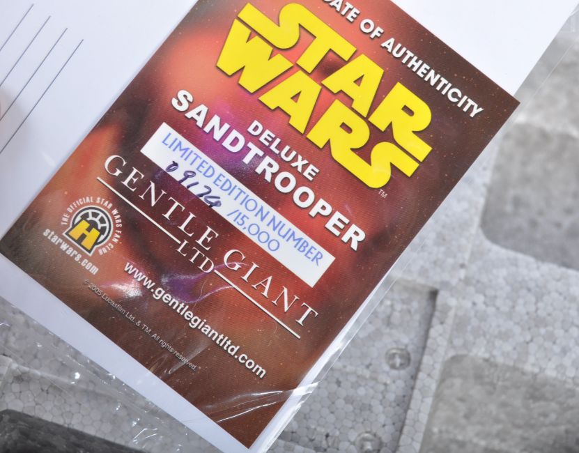 A Gentle Giant made Star Wars ' Collectible Mini Bust ' statue of ' Sandtrooper '. Superbly detailed bust depicting a Sandtrooper in typical form. Limited edition No.9174/15000, with certificate. Mint, within its original box. Impressive display piece.
