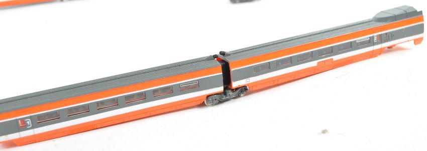 A Bachmann made N gauge model railway electric trainset locomotive set 51-4001 TGV The High Speed French Passenger Train set. Comprises of a powered car, non powered car and four carriages. Some minor details missing. Rare and highly detailed set.
