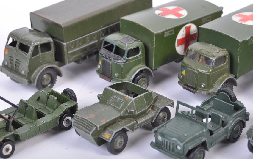 A collection of x12 original vintage Dinky Toys diecast model vehicles of Military / Army interest including cars, tanks, trucks and more. Examples of a Personnel Carrier, Scout Cars, Austin Champ, Austin Mini Moke, Military Ambulance and others. Models appear fair to good. A good collection of vintage diecast