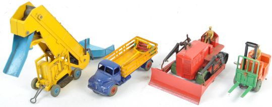 A collection of original vintage Dinky Toys made diecast model vehicles comprising boxed 401 Fork Lift Truck, 964 Elevator Loader, 931 Leyland Comet Lorry in partial box and Bulldozer in partial box. All models in VG condition. Good collection.