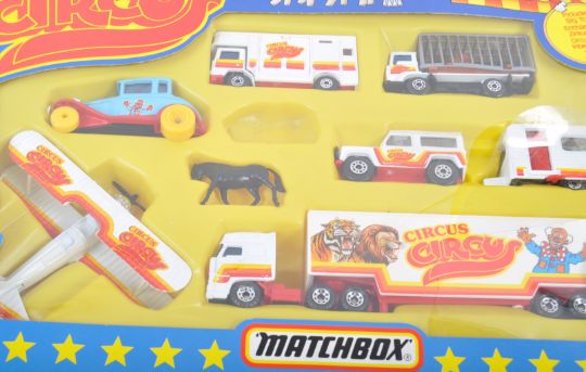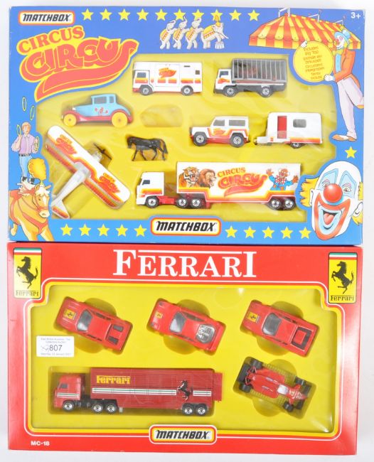 Two original vintage Matchbox made diecast model gift sets comprising MC-18 (MC18) Ferraro five vehicle set and MC-804 Circus Circus Big 10 Set. Both appear near complete within original boxes. Great sets.