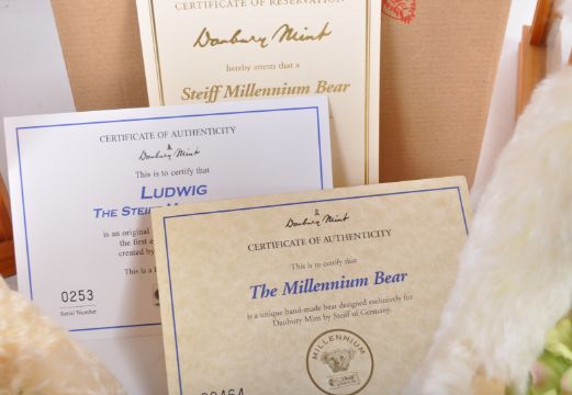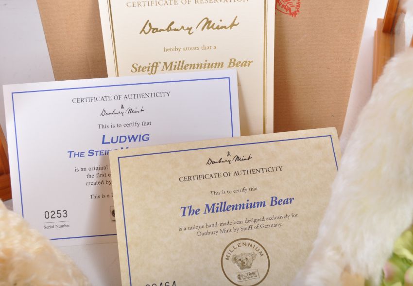 Two original German Steiff soft toy teddy bear 661686 ' Ludwig The Musical Bear ' and 654701 The ' Millennium Bear '. The musical bear having blonde mohair, black glass eyes and stitched brown nose. A key to back to can we wound up to play music. Decorated with checked bow and gold button with yellow tag to the left ear. Complete with certificate, canvas dust bag and perspex display case. The other being a Danbury Mint exclusive with gold medallion to the neck, green flower bouquet and original box. Bears to measure approx 30cm