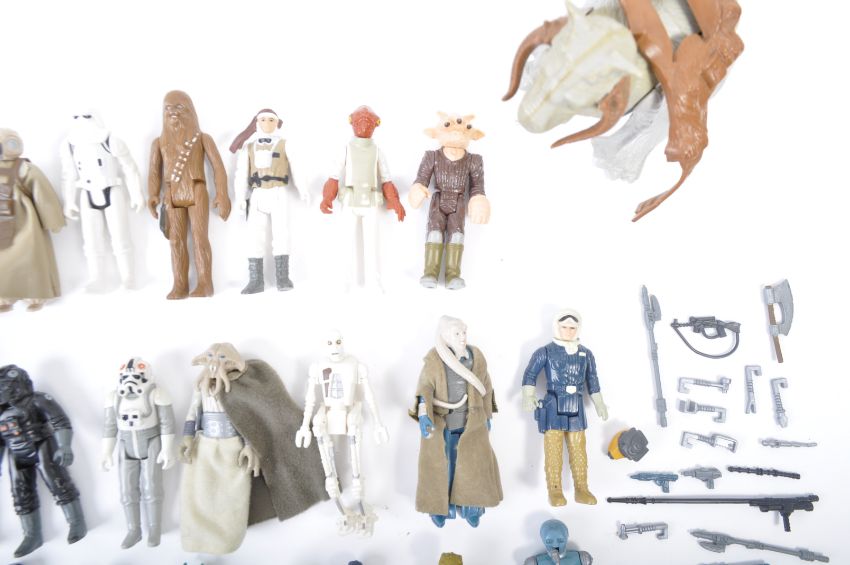 Star Wars Action Figures - A collection of 35+ original vintage Kenner / Palitoy made Star Wars action figures. Includes; Tauntaun (Hard belly), TIE Fighter Pilot, Bib Fortuna, Han Solo, R5D4, Lando Calrissian (Skiff), Klaatu, Greedo, Chewbacca, Admiral Ackbar, Ree Yees, Darth Vader and others. Some with original accessories / weapons / blasters present. Also includes a partial original Kenner catalogue showcasing the range. All from a genuine childhood collection.