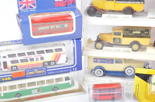 A collection of approx 25 assorted European scale diecast model buses coaches and cars to include Solido, Joal, Efsi, Majorette, Herpa, Brumm, Tomy Long Tomica and others. All models appear mint within original boxes. Good collection.