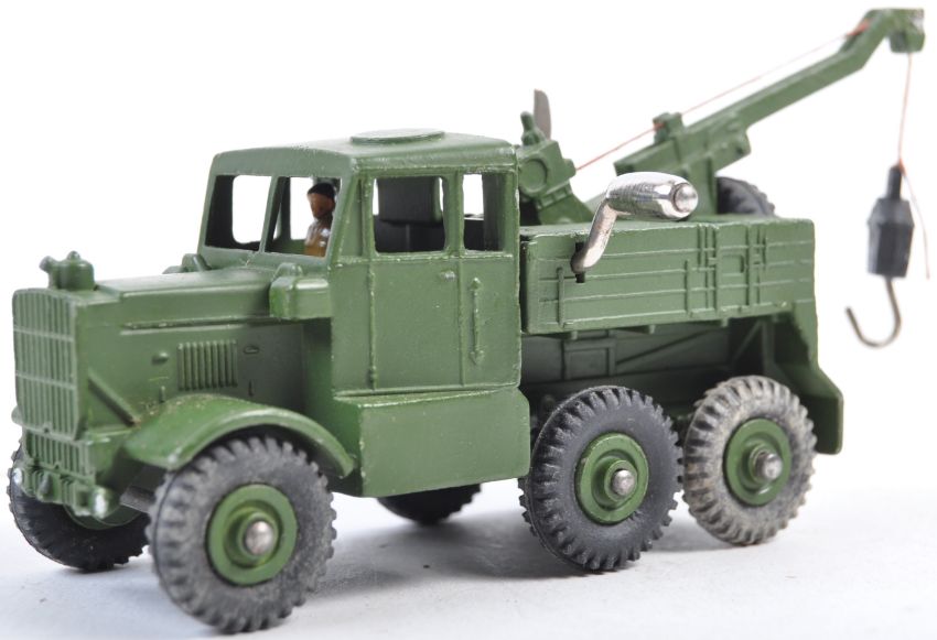An original vintage Dinky Toys Supertoys diecast model crane 726 Recover Tractor in military green. Model VG+ with hook in near mint original box with inner card packaging. Great example.