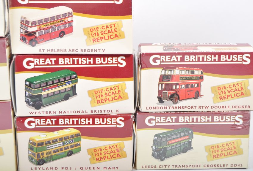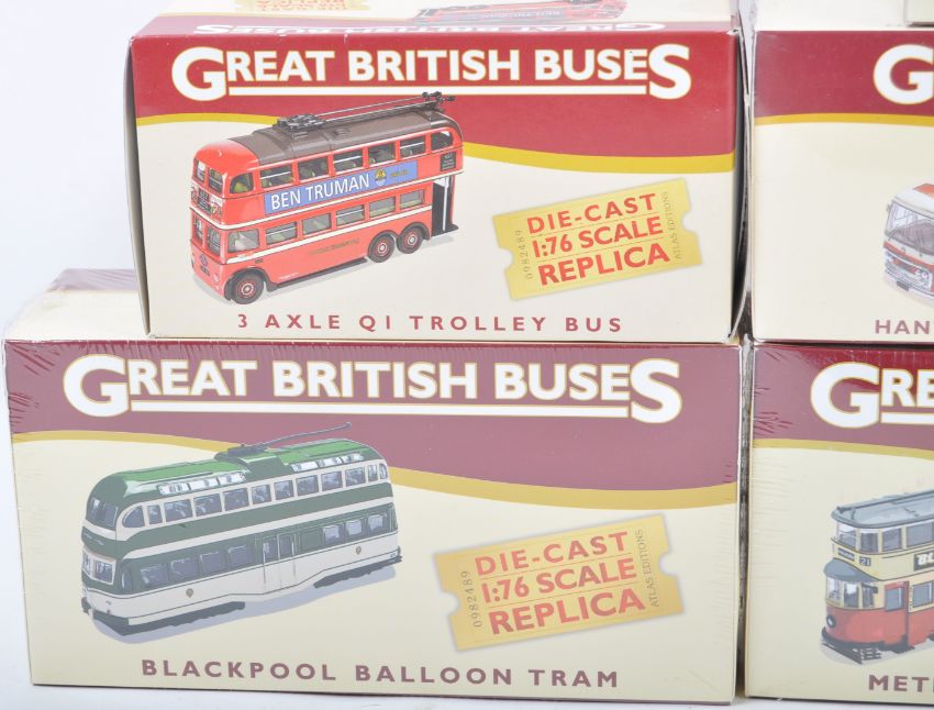 A collection of 13x Atlas Editions made 1/76 scale diecast model buses from the Great British Buses Collection. Includes trams, coaches, open top buses and more. All appear mint with some sealed. Good collection of bus models.