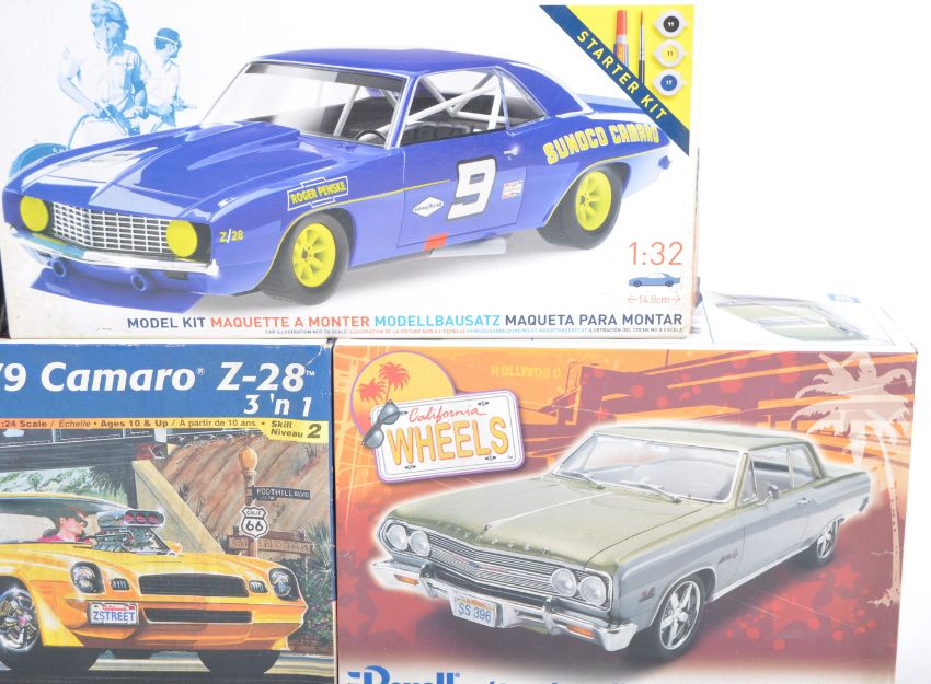 A collection of x5 assorted plastic scale model car kits of various scales and makers to include Revell, Minicraft, Hornby and Monogram. Models to include Revell 55 Chevy Bel-Air, 65 Chevelle, 79 Camaro, a Hornby Chevrolet Camaro and a factory sealed Minicraft 1962 Rolls Royce. A great collection of model kits