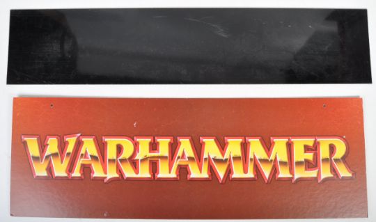 Two original Games Workshop Warhammer advertising point of sale shop display in store signs comprising an acrylic Games Workshop example and a card Warhammer 40k. Great display pieces. Measures: 95cm wide.