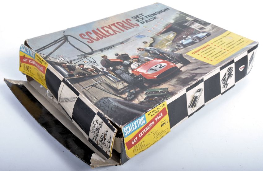 Two original vintage Triang made boxed  Scalextric slot car racing sets comprising model No. 31 and a Scalextric extension pack. The set No. 31 to include x2 cars, x2 controllers, straight and curved track pieces, and a selection of bridge pillars. The extension pack to include x2 change over tracks, spectator figures, starter on rostrum, hump back bridge, flag poles and x2 pages of starting flags / signals. Both sets retaining original boxes. Good collection of vintage Scalextric