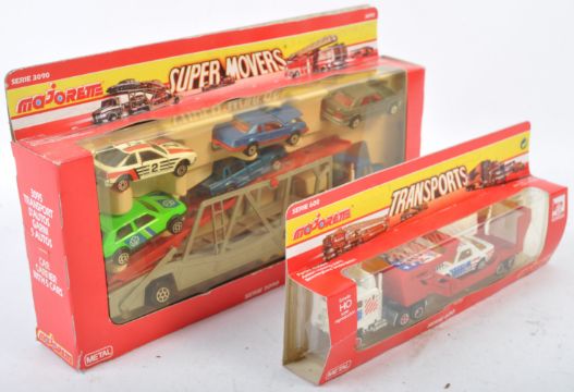 Two original vintage Majorette made boxed diecast model sets comprising Super Movers No. 3095 Car Transporter with x5 cars and No. 615 Race Hauler. Both models appearing unused, within original boxes