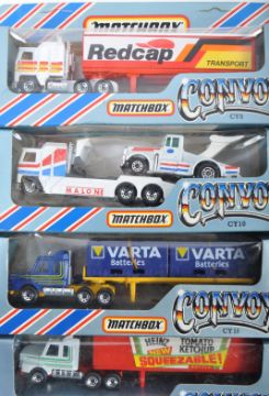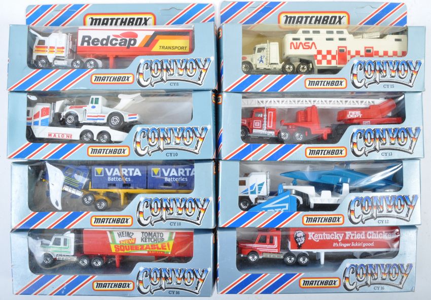 A collection of x8 original vintage 1980's Matchbox ' Convoy ' diecast model lorry / trucks to include CY-8 Kenworth Box Truck, CY-10 Kenworth Racing Transporter, CY-16 Scania Box Truck Fourgon, C-18 Scania Double Container Truck and others. All contents generally appear mint and likely unused. Housed in original boxes, some unpunched