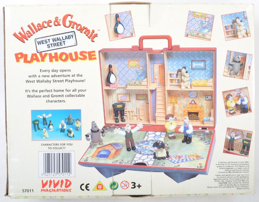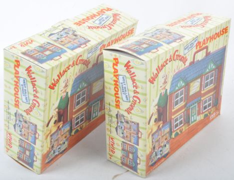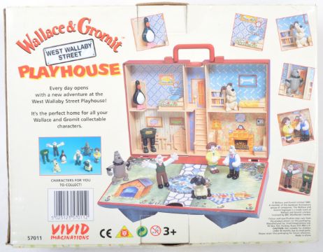 Two original vintage ' Vivid Imaginations ' made Aardman Animations Wallace and Gromit West Wallaby Street playhouse playsets. The playhouse carry case depicting the Wash ' N ' Go window cleaning service to the outside and opens to reveal four rooms with a staircase and garden. Models appear mint and unused within original boxes