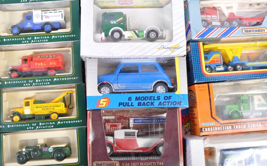 A large collection of assorted boxed diecast model cars of various scales and makers to include Matchbox, Matchbox Convoy, Lledo, Road Monster, Kentoys Wheelers, Dickie Diecast and others. Examples of car transporters, trucks, x2 Fast And Furious models, Mini Cooper, Ferrari, Jaguar XJII and others. Interesting assortment