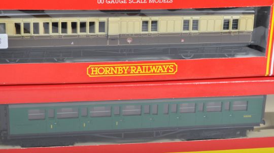 A rake of 10x Hornby made 00 gauge model railway trainset locomotive rolling stock carriages comprising:R4057, R123, R429, R484, R488, R4125B, R429, R488, R122 and R124. All appear mint within original boxes. Highly detailed models.
