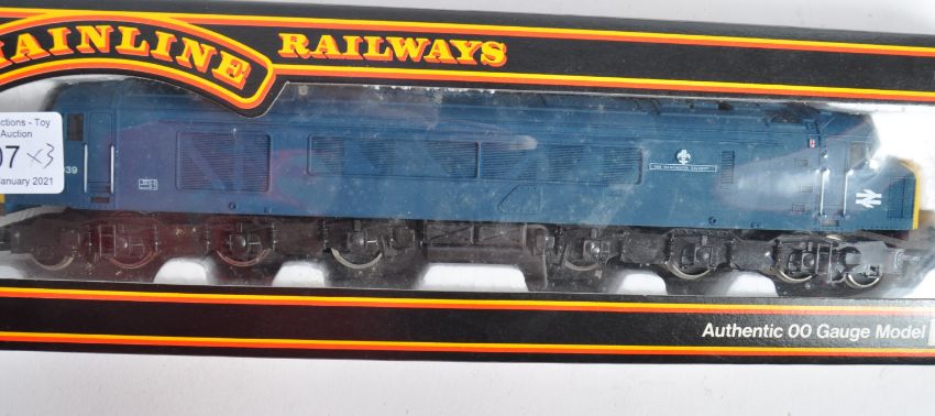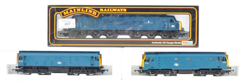 A collection of three 00 gauge model railway train set locomotive engines comprising: Hornby R068 BR Class 25 Diesel Blue, R084 BR Class 29 Diesel Blue and a Mainline 37-01 Class 45 1C0 0C1 diesel loco. All appear complete with functioning motors within original boxes.