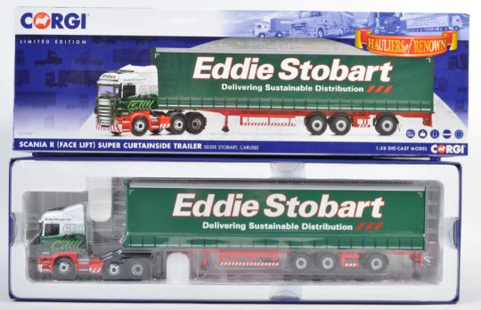 Two Limited Edition Corgi made 1/50 scale Hauliers Of Renown diecast model trucks to include models No. CC13747 Scania R (Face Lift) Super Curtainside Trailer - Eddie Stobart and CC15501 Volvo F12 5 Axle King Trailer & Load - Pickfords. Contents appearing mint within original boxes. Highly detailed models.