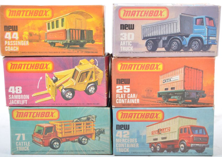 A collection of 10x original vintage 1970's / 1980's Matchbox Superfast / 1-75 Series boxed diecast models comprising numbers No. 14 Petrol Tanker, 30 Artic Truck, 44 Passenger Coach, 71 Cattle Truck and others. All good models within original boxes