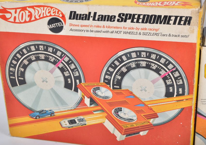 A collection of original vintage Mattel made Hot Wheels Redlines boxed accessory sets and carry cases comprising a vinyl 24 car collector's case, Revvers Team Case, boxed Sizzlers Power Pak, Dual Lane Rod Runner and Dual Lane Speedometer. Great collection.