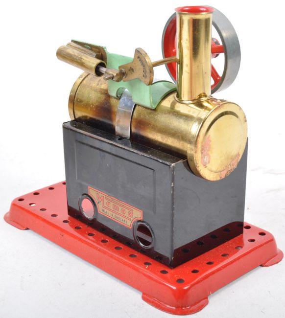 An original vintage boxed Mamod made stationary Steam Engine model ' M.M.2 ' Minor No.2. A liquid fuel example with polished brass boiler. Mounted to a red metal baseplate to fit Meccano. Plastic filler funnel and instructions present. Housed within original box. Great model