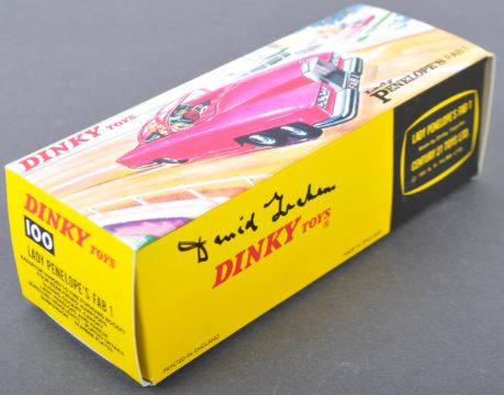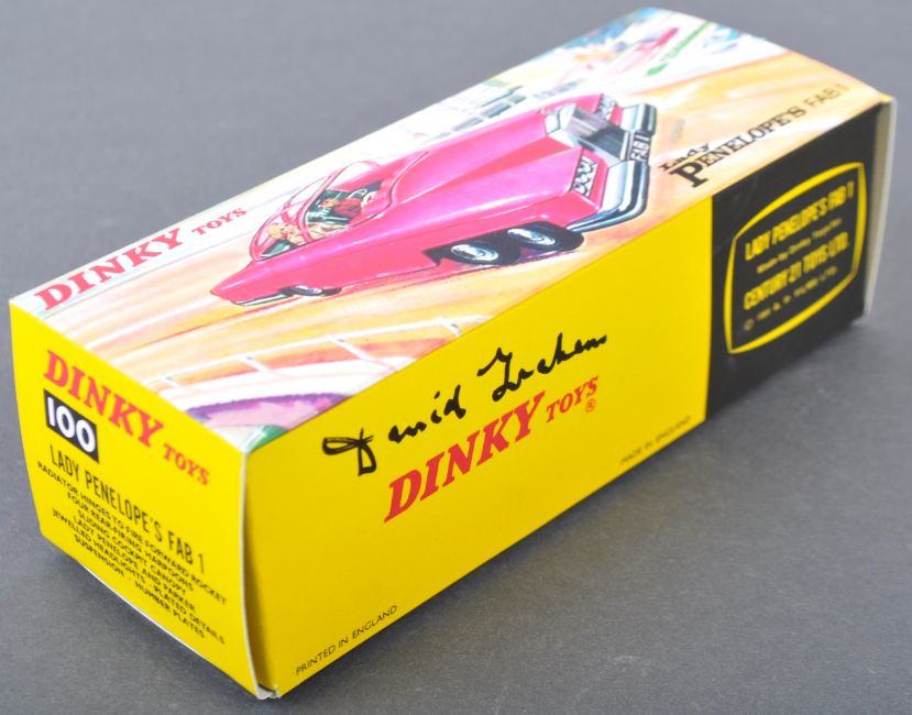 Thunderbirds - a replica Dinky Toys diecast model box (box and stand only - no model) for the original No. 100 ' FAB 1 ' model. Autographed in two places by voice actor David Graham (who voiced Parker in the series). Signed neatly to the box and display stand in black ink. Wonderful display piece.