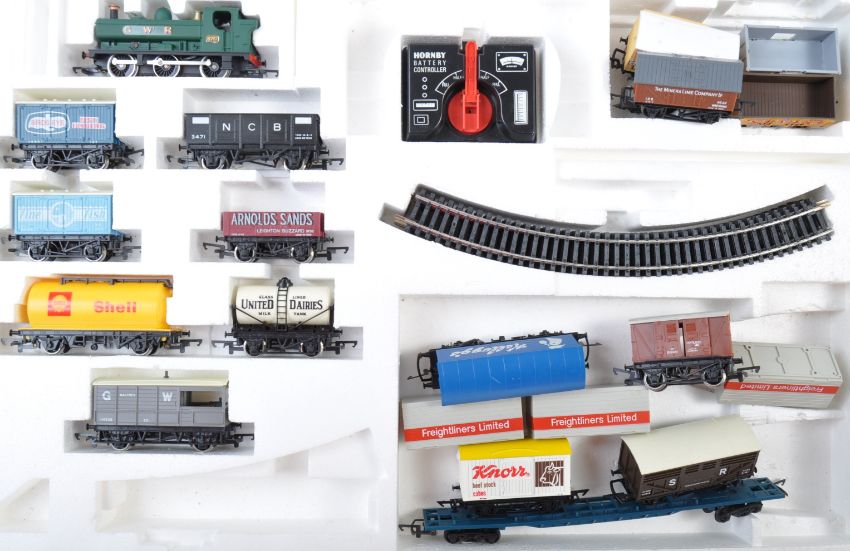 A collection of original Hornby 00 gauge model railway electric trainset locomotives, rolling stock and x2 boxes. Items to include British Railways Inter-City locomotive and matching carriages, x2 battery controllers, selection of curved track and a large quantity of assorted wagons and rolling stock. Good collection