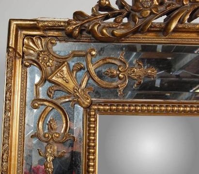 A large and impressive contemporary French antique style wall mirror having a central rectangular mirror glass panel set within a gilt frame with four further mirror panels having a applied scrolled floral garland mount to the top and pierced decoration accents to the corners. Measures 192 x 136cm.