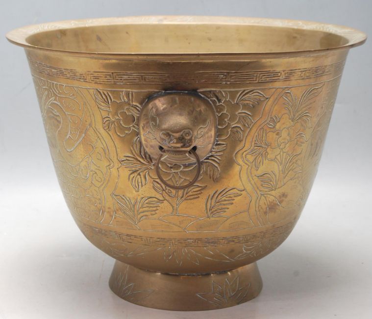 A large early 20th century circa 1920’s Chinese oriental brass plant pot of tapered form having engraved traditional Chinese motifs with dragons and peacocks, raised on a circular foot with two dragon head handles. Chinese character marks to the underside. 33cm diameter.