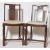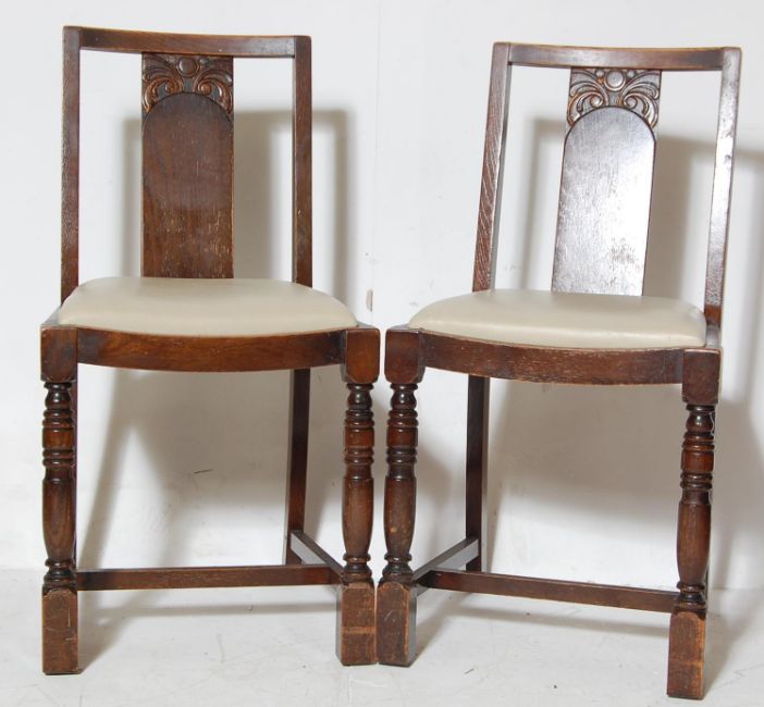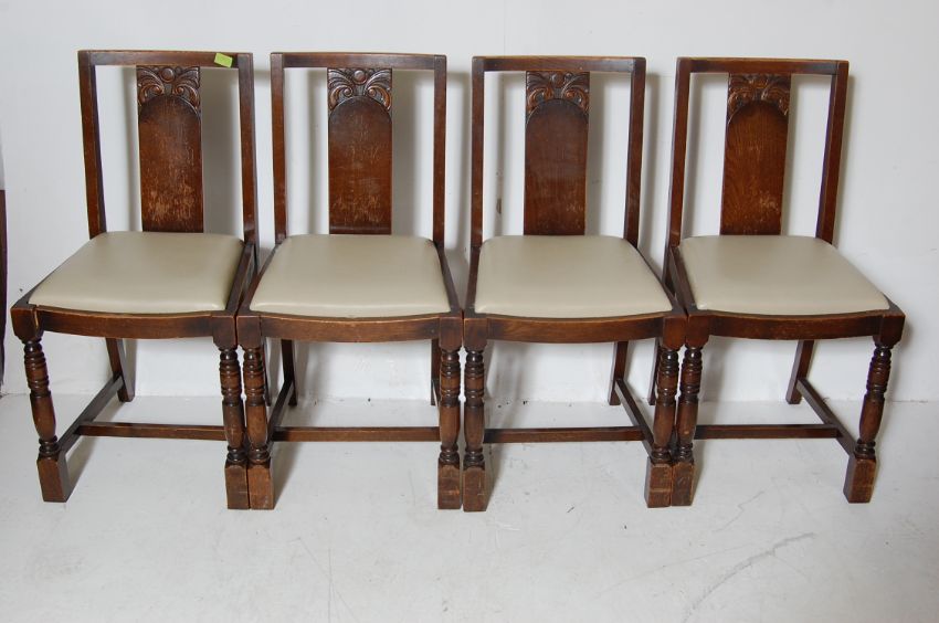 A set of four vintage 1950s mid century oak Ercol dining chairs having carved backrests with over drop in seats raised on drop in seats united by h stretchers. Comes with a vintage oak drop leaf dining table. Ercol label to the base H74cm x W89cm x D41cm