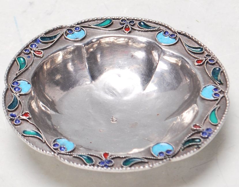 An antique early 20th century Imperial Russian 1000 grade silver having fine cloisonne enamel decoration raised on three bun feet. Weighs 11.2g. Measures 6.5cm.