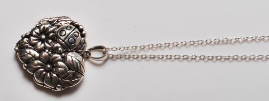 A stamped .925 sterling silver pendant necklace having a heart shaped double hinged locket decorated with flowers and a ladybird. The necklace is on a .925 chain link with lobster clasp. Gross weight 10.3g. length 42cm.
