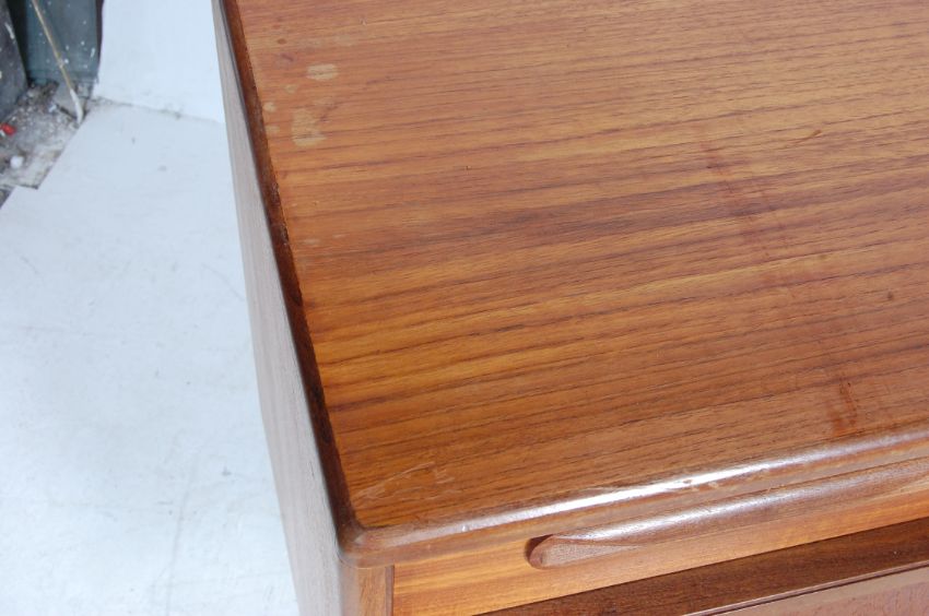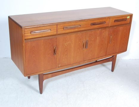 Victor B. Wilkins - G Plan - Fresco - A 1960's retro vintage small proportioned teak wood sideboard credenza having four drawers above a central twin door shelved cupboard flanked by single door cupboard to either side, all raised on short round tapering legs with shaped stretcher. H85cm x W153cm x D46cm