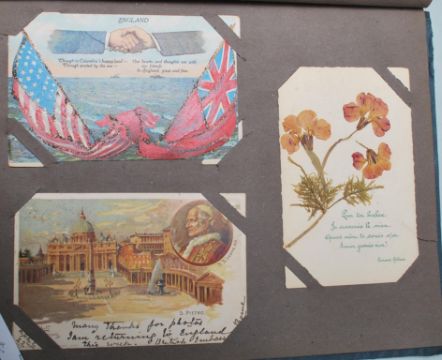 Amazing old time collection of Foreign postcards housed in antique album.Early to circa WWI. Good mixture of subject cards and topography (street scenes). With Gruss Aus, Chromo Litho, Transport (Bus, Carts, Shipping), Disasters (fire, floods, explosion, volcano eruption, earthquake, bomb damage) Novelty, Advertizing, Comic, Ethnic. Most impressive range (x165).