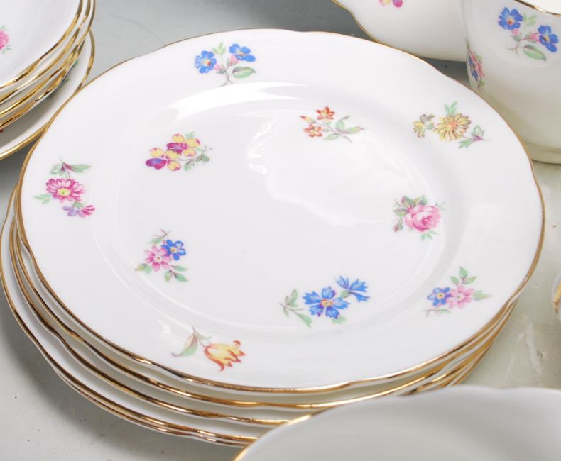 A six person tea set by Adderley in Chintz pattern comprising of six cups, saucer and cake plates, creamer jug, sugar bowl. All with makers mark underside. Along with a six person Empire tea set in Bouquet Roses pattern comprising of six cups, saucers, and cake plates, creamer jug and sugar bowl.