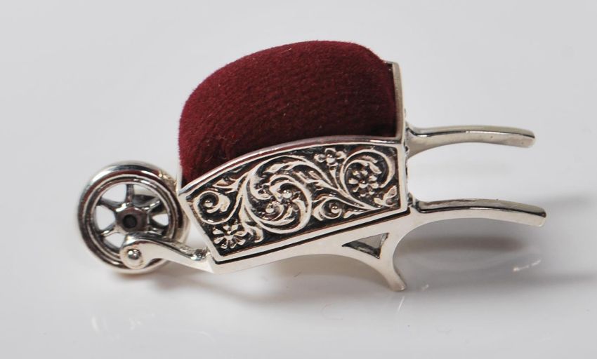 A sterling silver wheelbarrow pincushion with red velvet cushion to the top. Gross weight 16.6g. Stamped sterling to the verso
