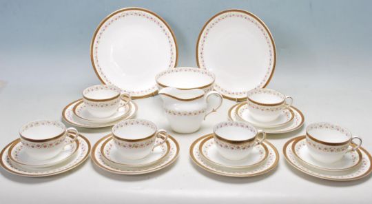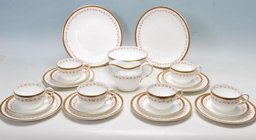 Antique Victorian Collingwood fine bone china 21 piece tea service having rose bud decoration throughout with a Greek Key border. The tea service comprises of cups, plates, bowl, creamer jug and more. Stamped 1856 to the underside. Measures 23cm diameter.