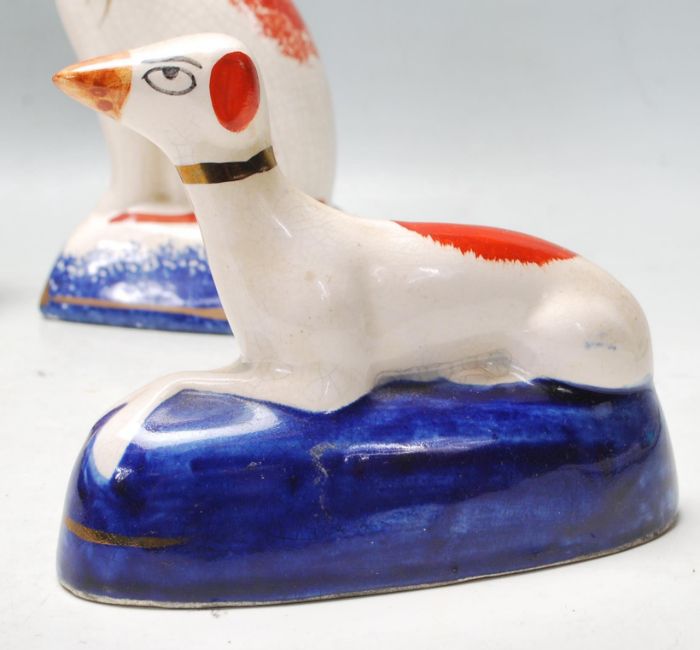 A group of 19th century and 20th century antique Staffordshire pottery to include a large mantle fire dog, pair of cats, greyhounds, etc., along with an antique blue and white comport / tazza and two period jugs. Measures 34cm high.
