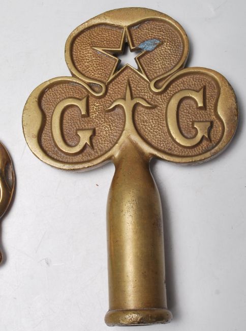 Two vintage 20th century solid brass Girl Guide / Scouting interest flag pole banner top finials with pierced decoration. 16cm long