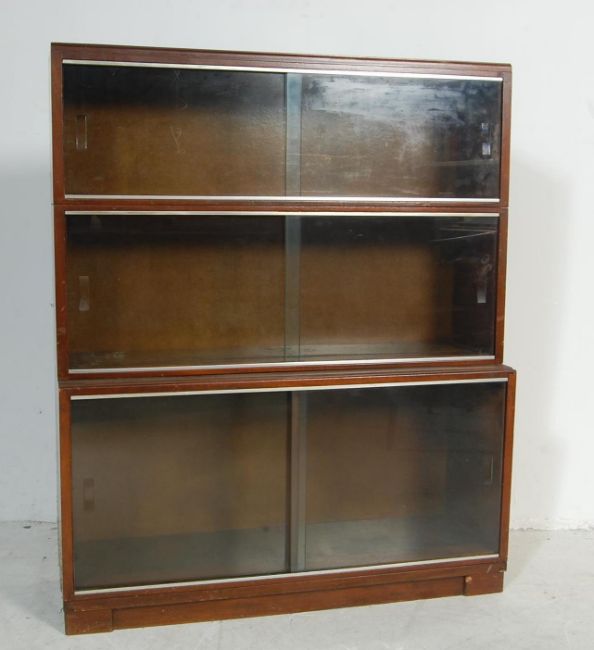 Minty - A vintage retro 1960s 20th Century English oak two tier library stacking lawyers Globe Wernicke style bookcase cabinet. The bookcase having two twin sliding glass door compartments support by a concealed cupboard base having chrome handles. Label for Minty present.