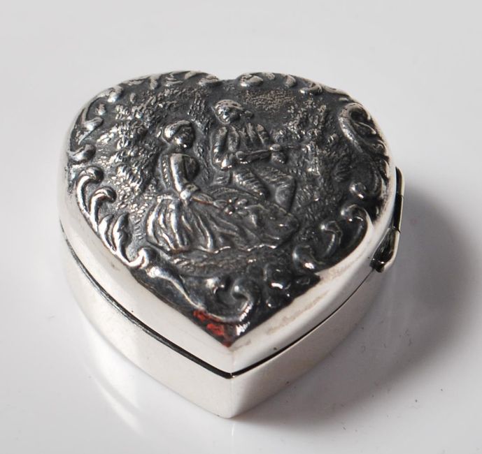 A .925 silver pill box in the form of a heart decorated with a courting couple. The pill box has a hinged lid and is stamped STERLING to the verso. Weight 10g. 28mm long.