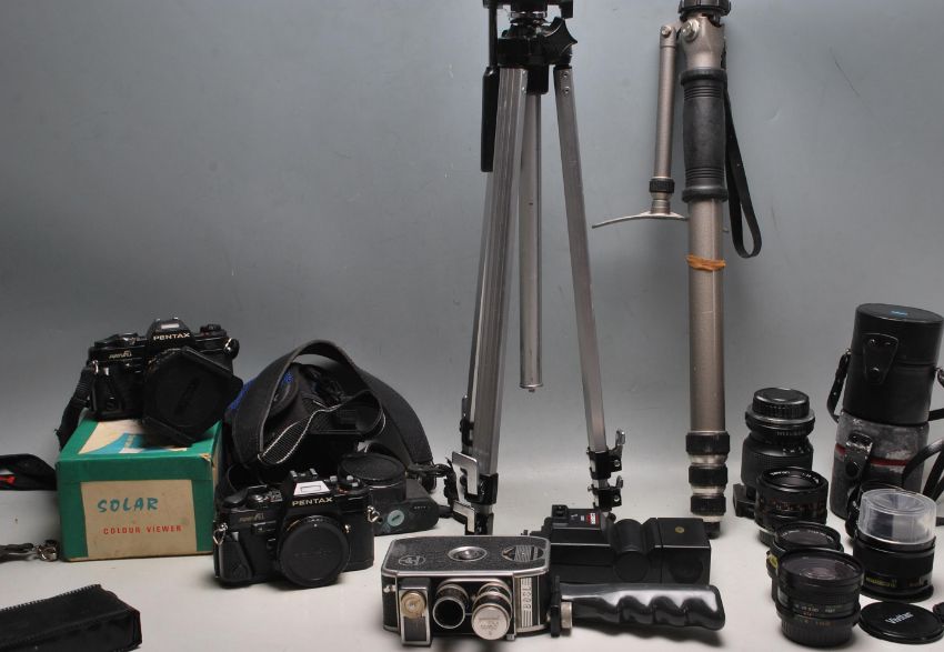 A collection of vintage 20th century 35mm cameras / photographic cameras and lenses to include a two Pentax Super A No. 14615567, Pentax Program A, No. 1416622, SMC PENTAX - A ZOOM 1:4 35-70mm lenses, Tamron 70-210mm 1:4-5.6 lenses, Vivitar 19mm 1:3.8 MC Wide Angle lenses, Tamron SP BBAR MC Teleconverter 2x, SMC Pentax - M 1:2.8 28mm Asahi lenses, Tamron BBAR Multi C 1:2.8 28mm, SMC Pentax -a 1:1.7 50mm, Bolex Paillard B8SL 16mm video camera, Cobra D400 flash, Lloytron V210 micro cassette recorder, Solar colour viewer, Sony Cyber-shot 7.2 megapixels, etc