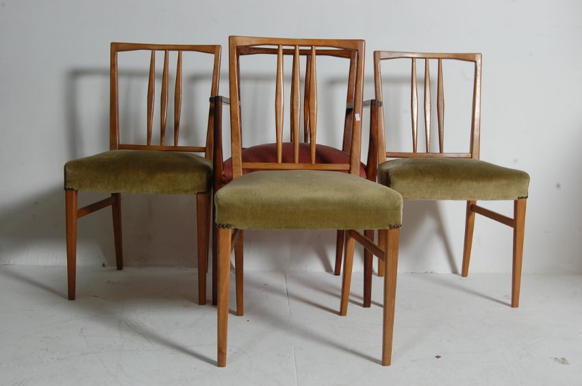 A set of four vintage retro 20th century teak wood dining chairs having curved backrests and padded seats raised on shaped supports H85cm x W52cm x D47cm