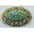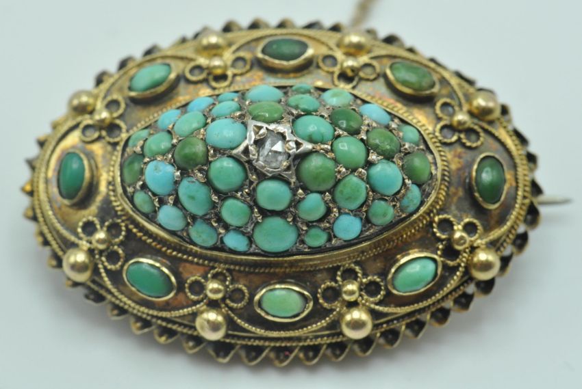 A 19th century Victorian yellow metal and turquoise brooch of an oval form with foliate decoration and a white stone to the centre. No marks. Weight 10g. Measures 34mm length.