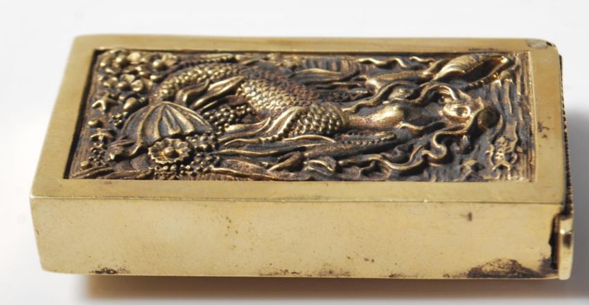 An early 20th century style brass vesta case having mermaid decoration to both sides and strike plate to the top. Measures 6cm.