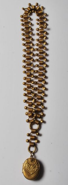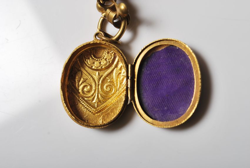 A 19th Century Victorian antique gilt collar necklace having large coiled links with an oval locket pendant having raised scrolled decoration suspended from a large spring ring clasp. Necklace measures approx 19cm, drop measures approx 7cm.
