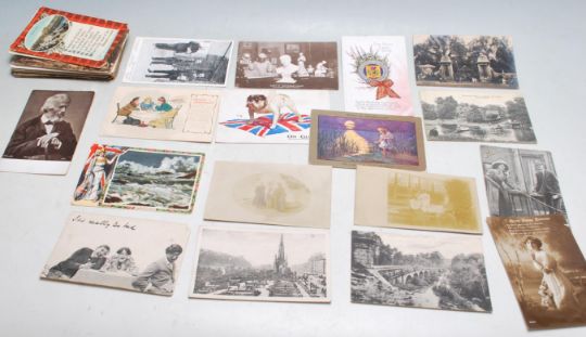 SUFFRAGETTES / WSPU INTEREST; Rare real photo postcard of Emmeline Pankhurst addressing crowd in Pembrokeshire and Votes for Women comic card amongst a group of 60 antique postcards in tin. Original all used cards addressed to a Miss Umpleby of Yorkshire. Small but outstanding selection.