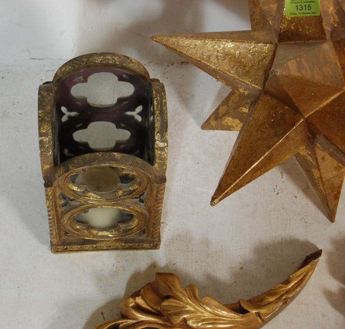 A collection of 20th century Victorian antique style gilded decorative furniture to include a wall mounted sconce of foliate design, two candle holders, decorative star and a wall hanging shelf