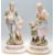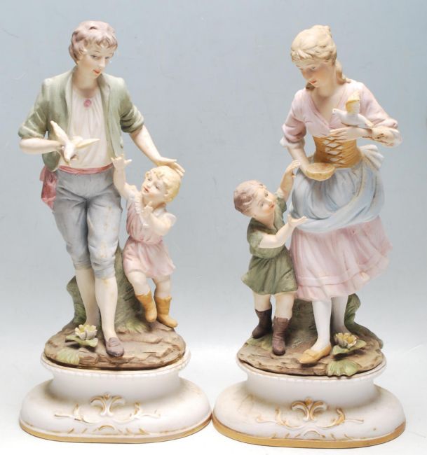 A pair of 20th Century bisque porcelain figurines depicting a couple with doves and children raised on plinth bases. Unmarked. Measures 37cm. Male figurine needs regluing to the base.