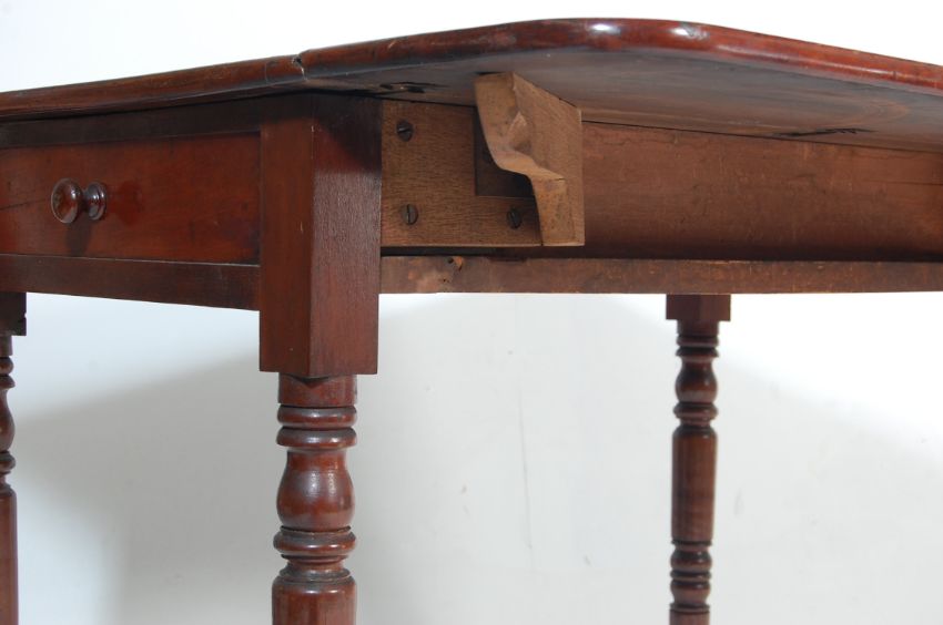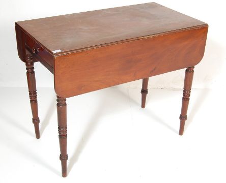 An antique Victorian 19th Century mahogany Pembroke dining table of rectangular form having drop leaves with chamfered edges over a single drawer raised on turned legs set on castors.Measures  75 H x 91 W x 90 D
