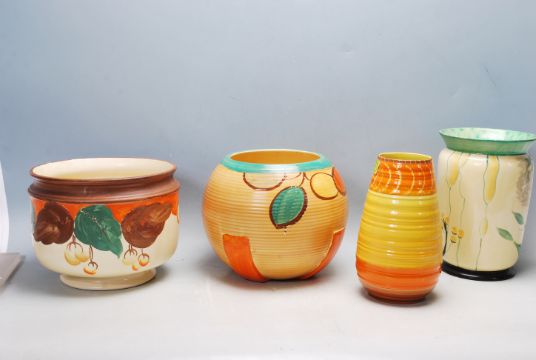 A collection of early 20th century 1930s Art Deco ceramics comprising of two Myott China jardinieres, a large Myott china vase & one Shelley ware vase. Measures 26cm tall.