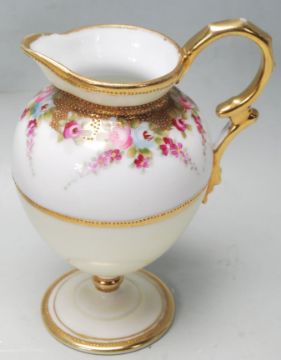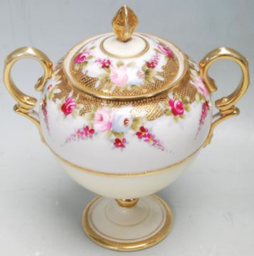 An antique early 20th century Japanese Noritake pedestal tea set having finely hand painted floral and gilt decoration. The tea service comprises of cups, saucers, tea pot, sugar bowl and more. Makers stamp to the base. Measures 45cm tall.